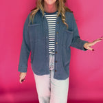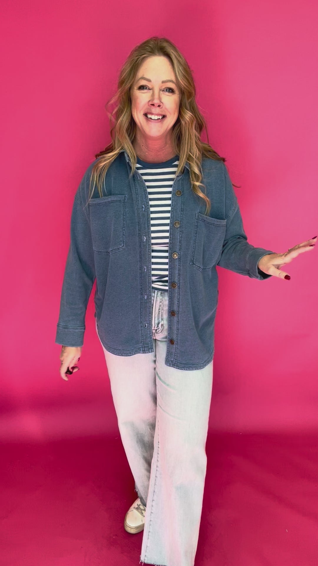 Soft, casual, and a little wild—the All Day Knit Jacket in Denim is your new go-to layer when you want comfort with attitude. Crafted from 100% cotton French Terry with a heavy soft wash, it delivers that perfectly broken-in feel from the very first wear. The playful leopard print, button-front closure, and patch pockets give it just the right amount of edge while keeping it effortlessly functional.