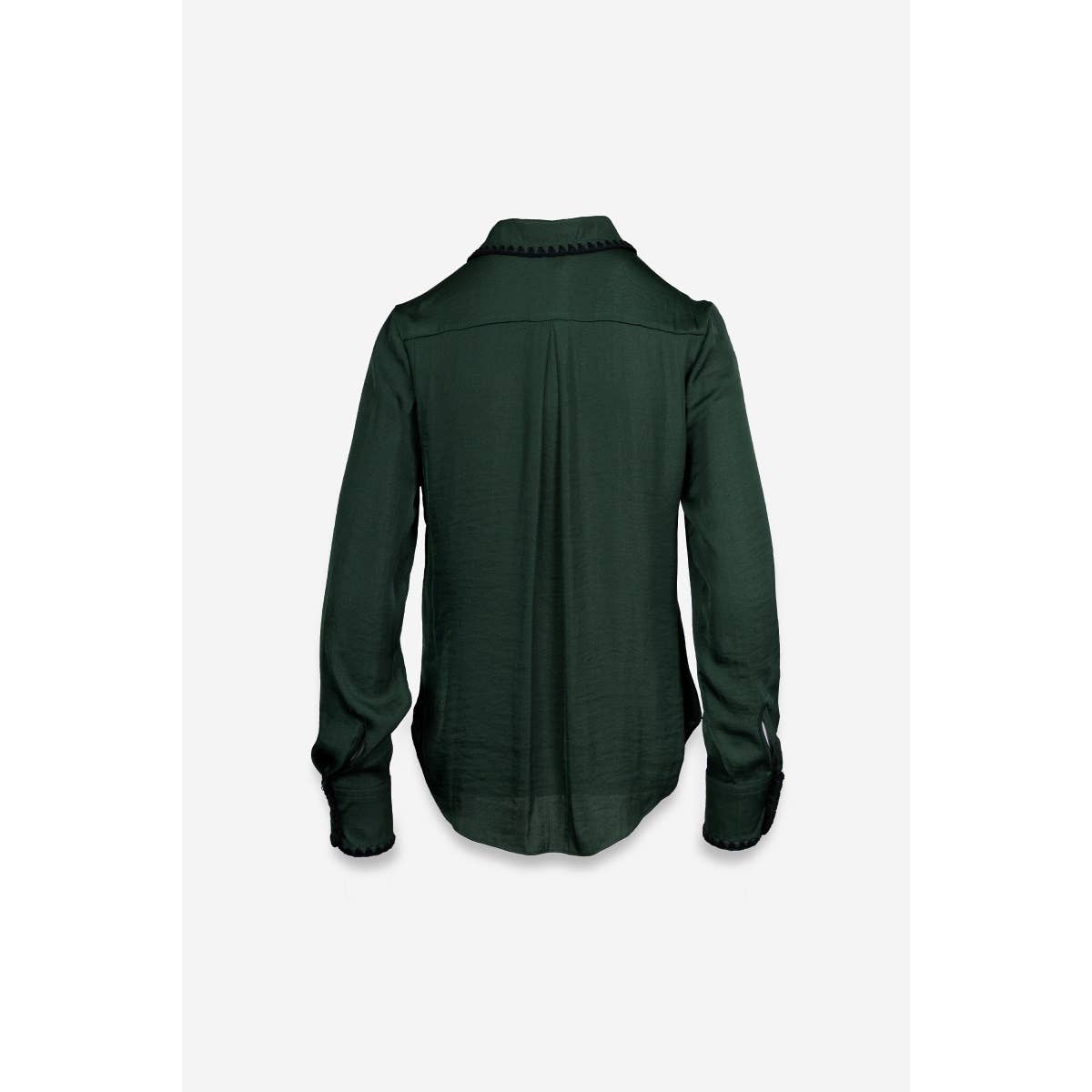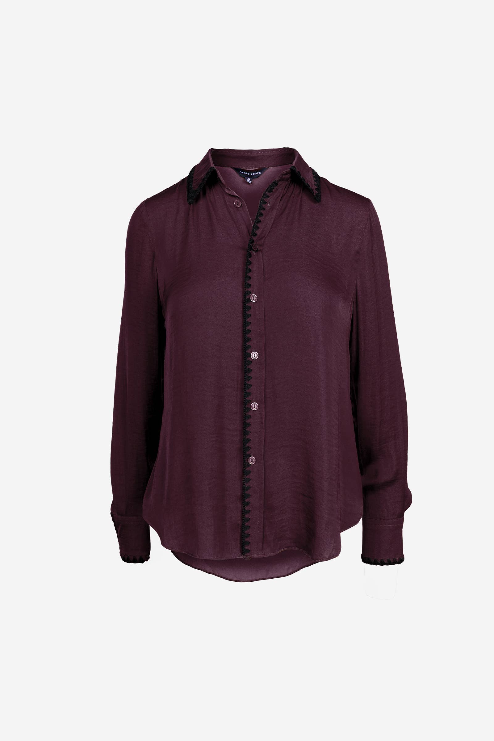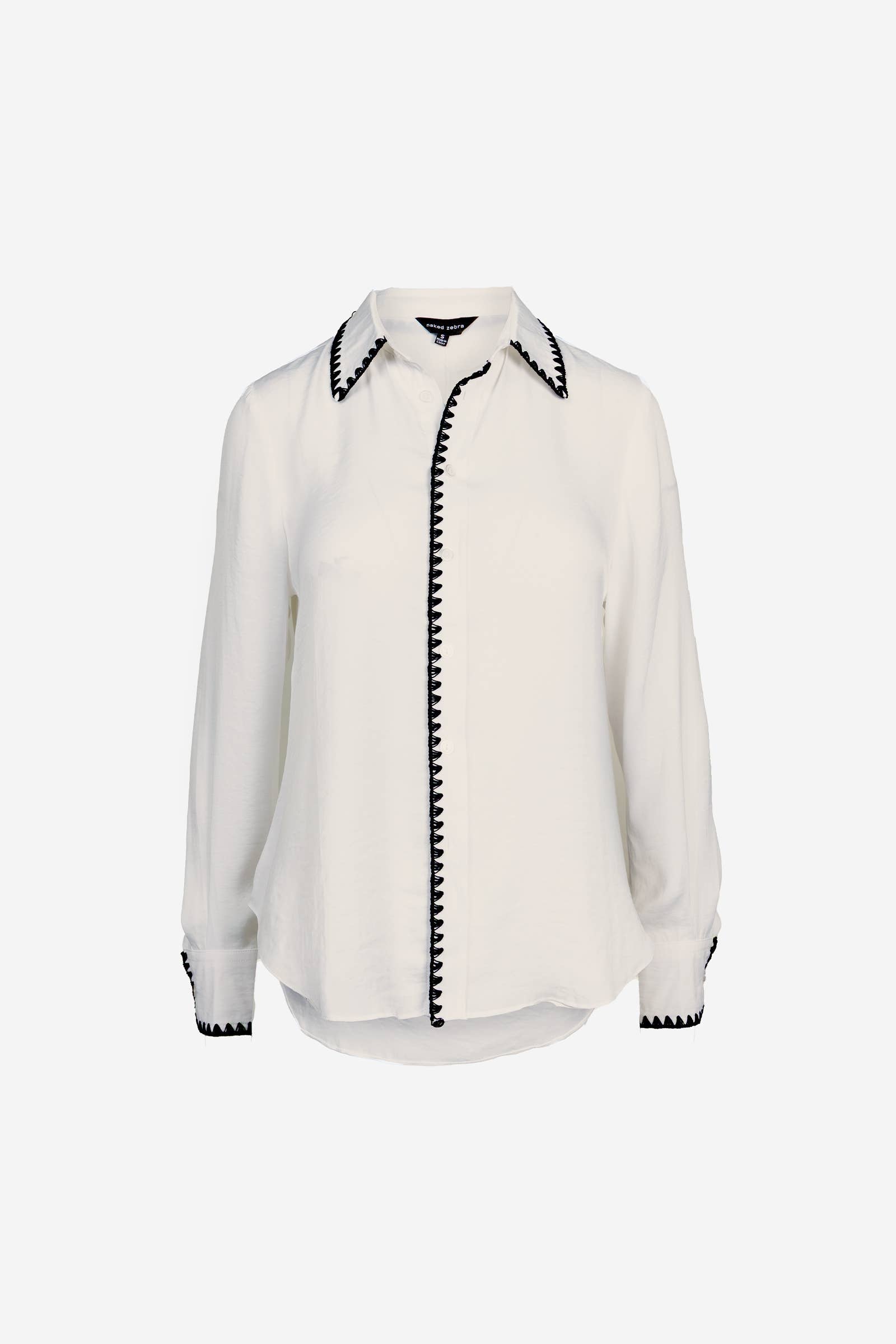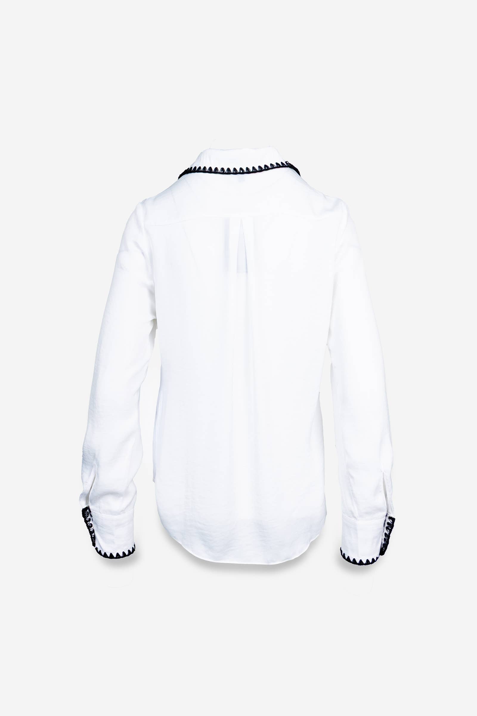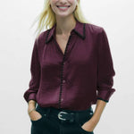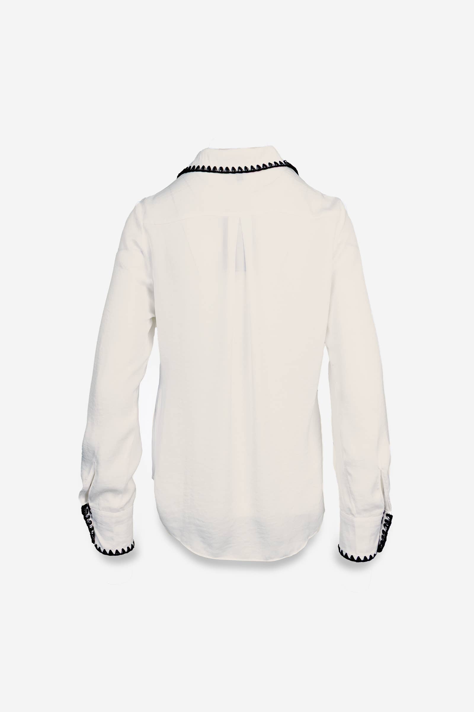 Your everyday button-up just got a serious glow-up. This silky satin blouse features contrast blanket-stitch detailing that adds the perfect touch of personality without overpowering the clean, classic design. It’s relaxed, elevated, and effortlessly chic—your new go-to for work, weekends, and everything in between.