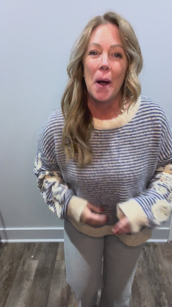 Bring a touch of charm to your cool-weather wardrobe with this striped sweater top, finished with delicate floral embroidery along the sleeves. Crafted from a soft recycled knit blend, it offers just the right mix of cozy texture and eco-conscious design. With its relaxed fit and dropped shoulders, this piece layers effortlessly over dresses or pairs perfectly with denim and trousers for an easy elevated look.