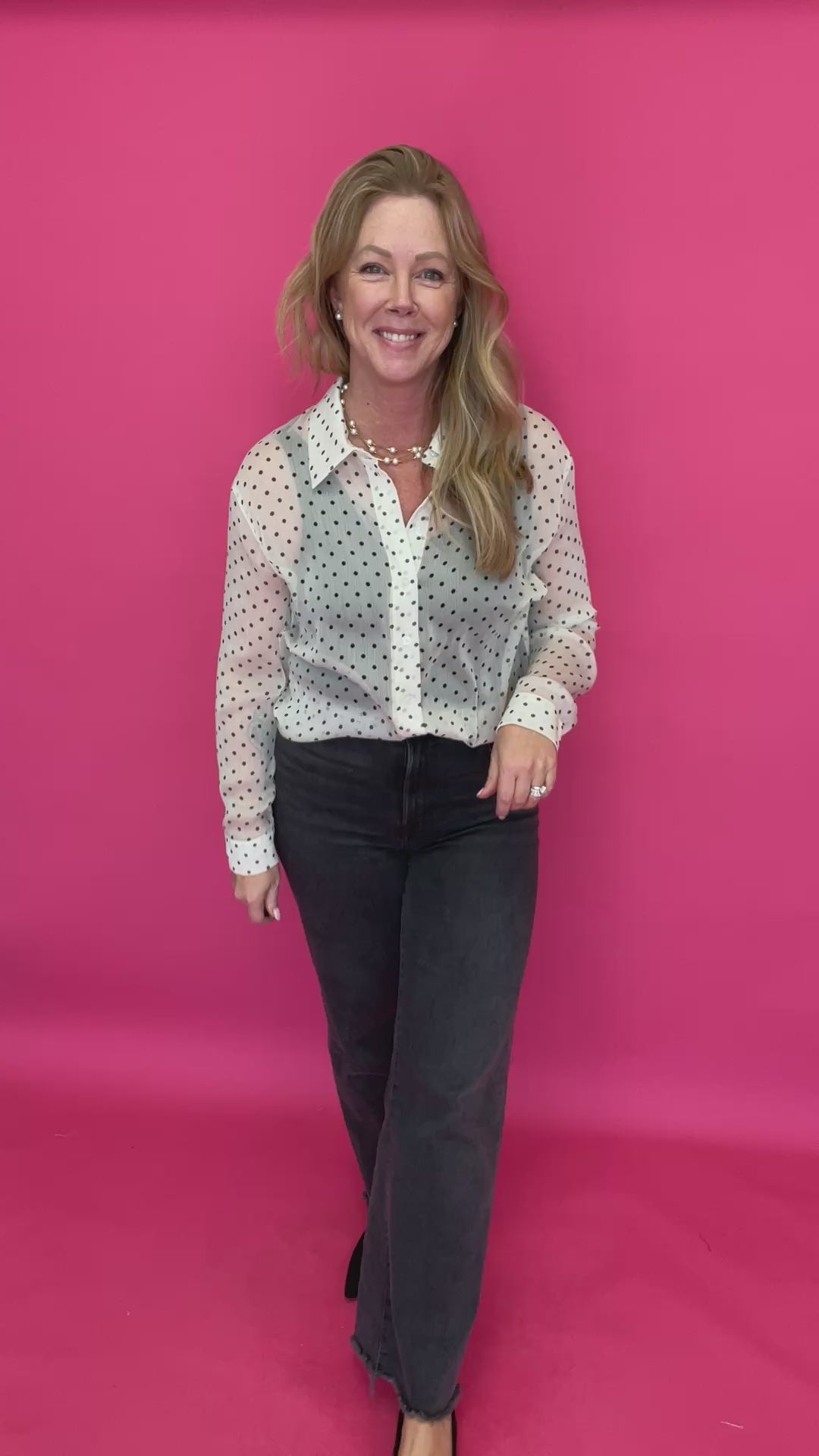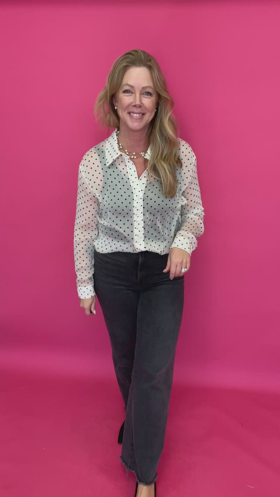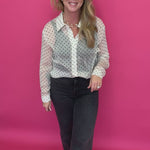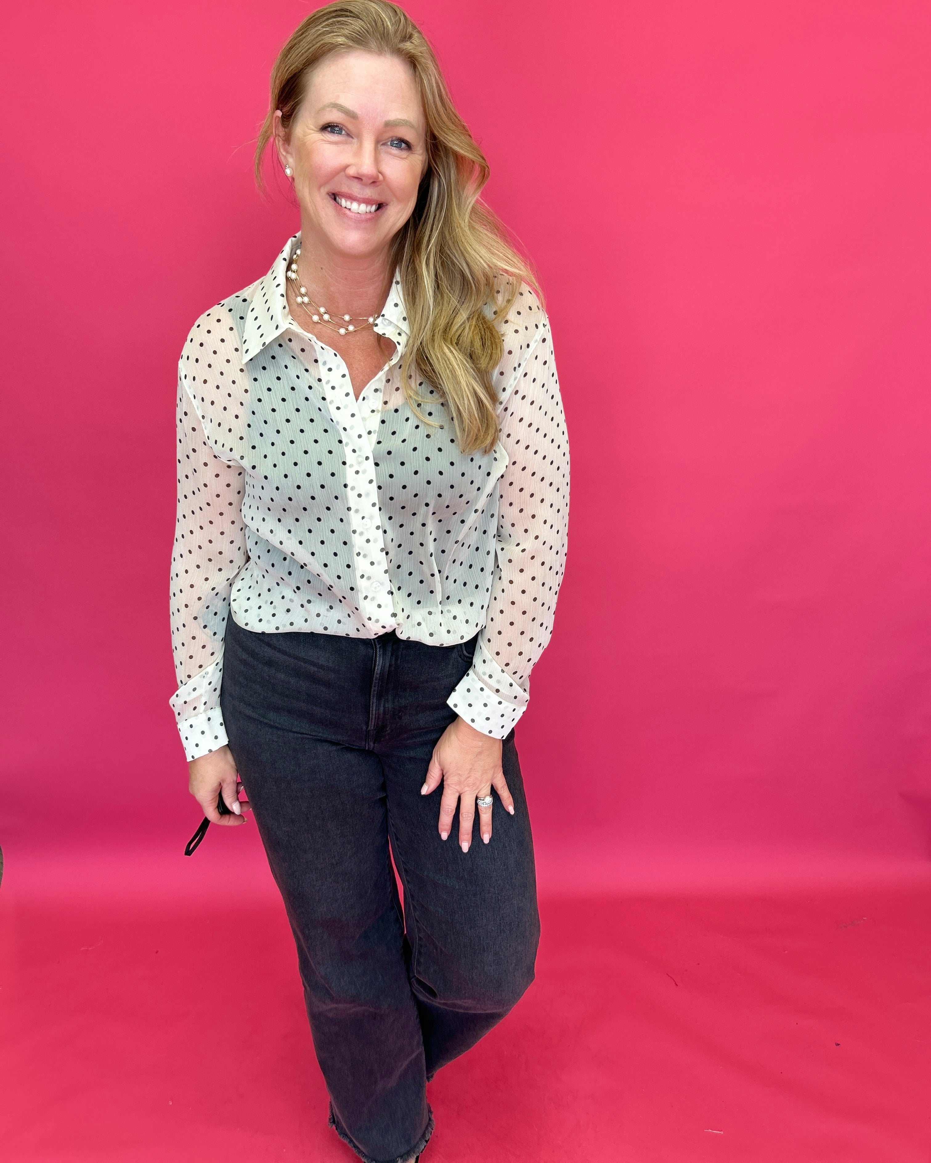 ou know those tops that instantly make an outfit feel done? This is one of those. The Cecilia Polka Dot Button-Up has that playful charm you love, mixed with a classic silhouette you’ll keep reaching for.