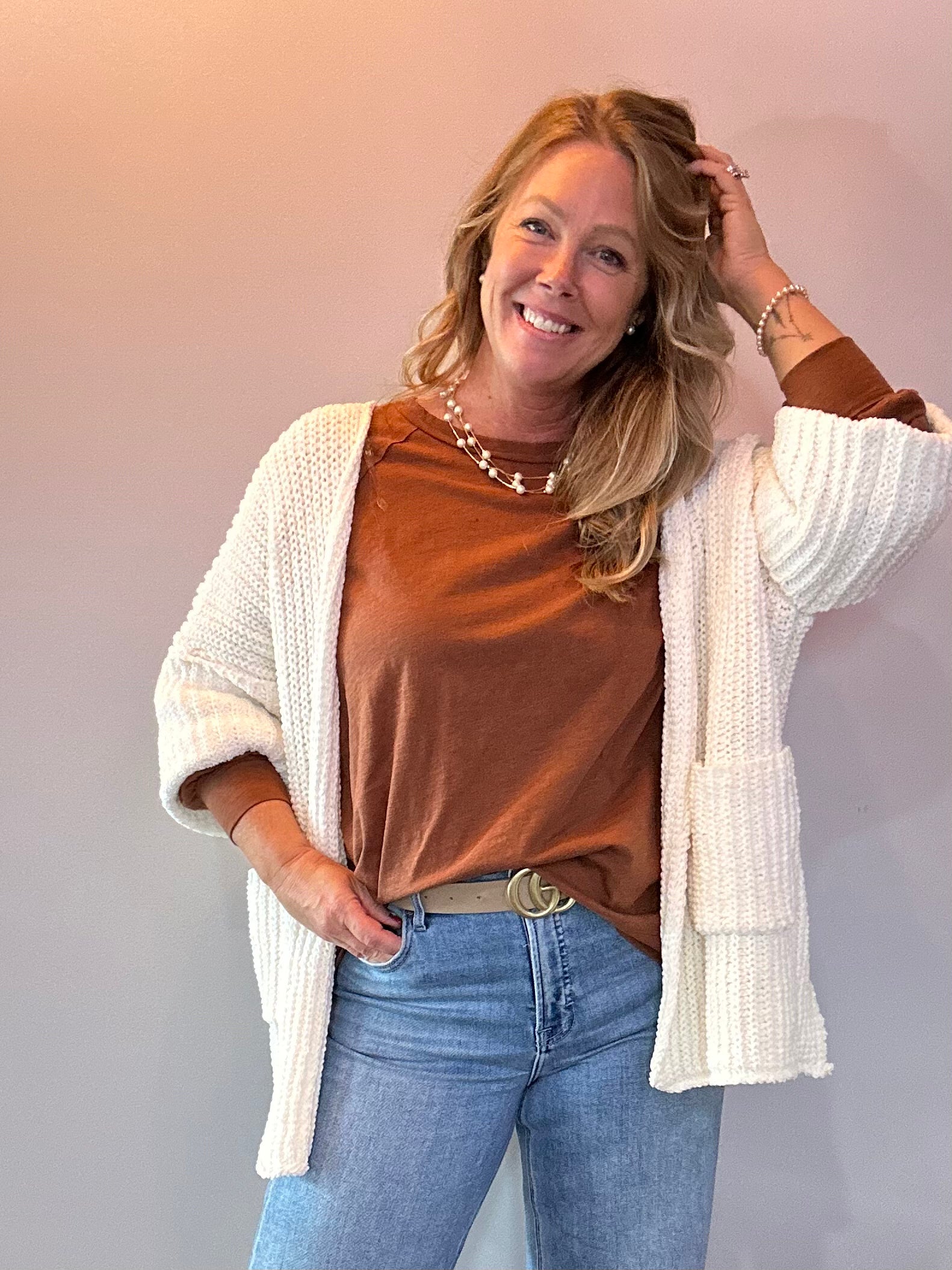 Effortless layering at its finest. This edge-to-edge cardigan is designed with a roomy fit, long sleeves, and practical pockets—perfect for slipping on over any outfit. Crafted from soft polyester knit, it drapes beautifully while keeping you cozy through every season.