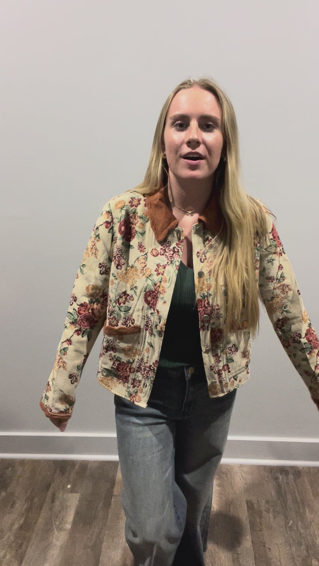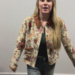 Elevate your layering game with this statement-making floral jacquard jacket. Featuring a button-front design, the jacket is trimmed with corduroy scallop edge detailing for a touch of texture and feminine charm. The floral jacquard weave brings depth and elegance, while the structured silhouette makes it easy to style for both casual and dressed-up looks. Pair it with denim for an everyday chic vibe, or layer over a dress for a polished finish.