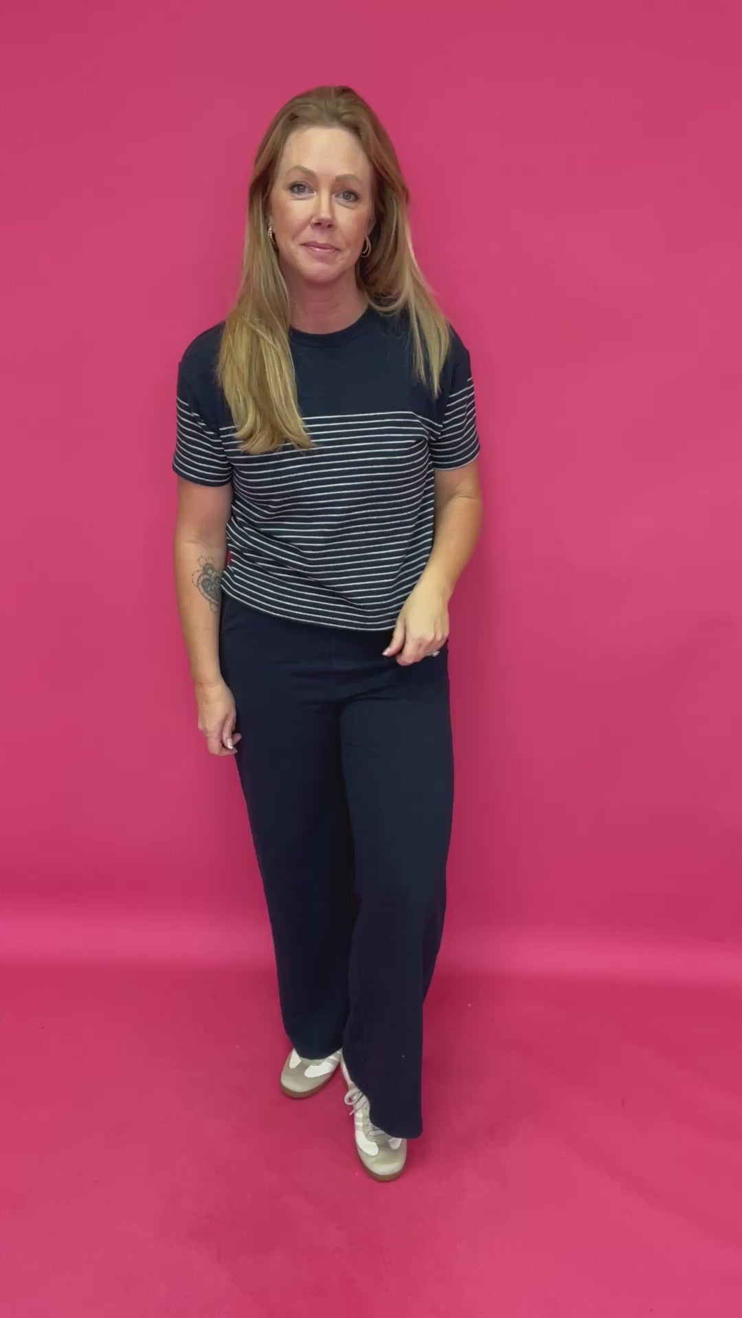 Care is simple: Machine wash cold (gentle), hang to dry. Easy, comfy, and cute—basically everything we want in a striped top 😉