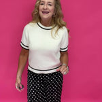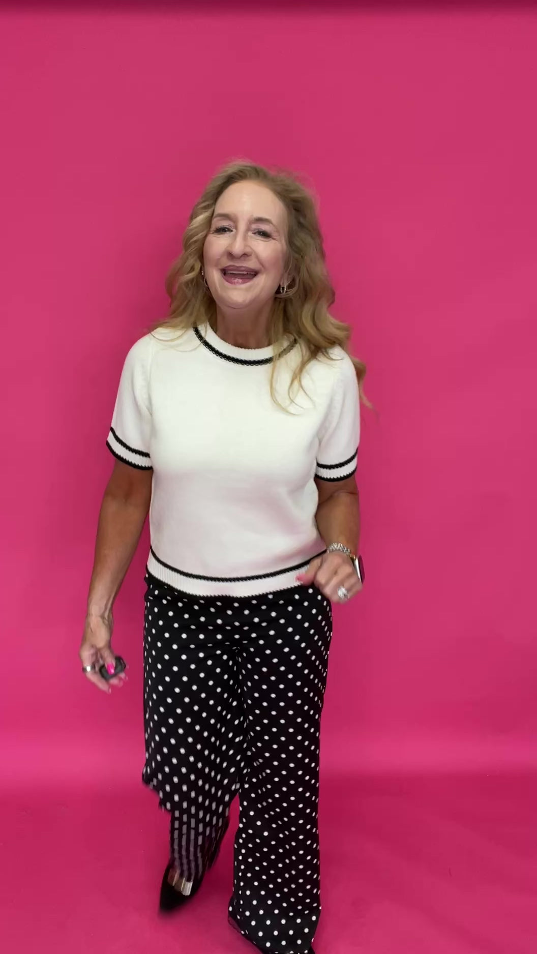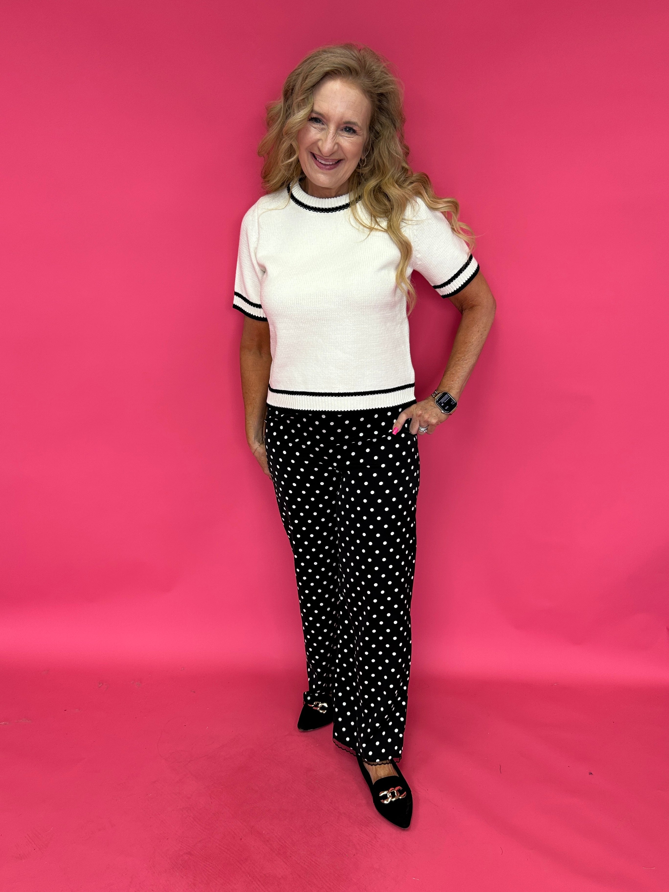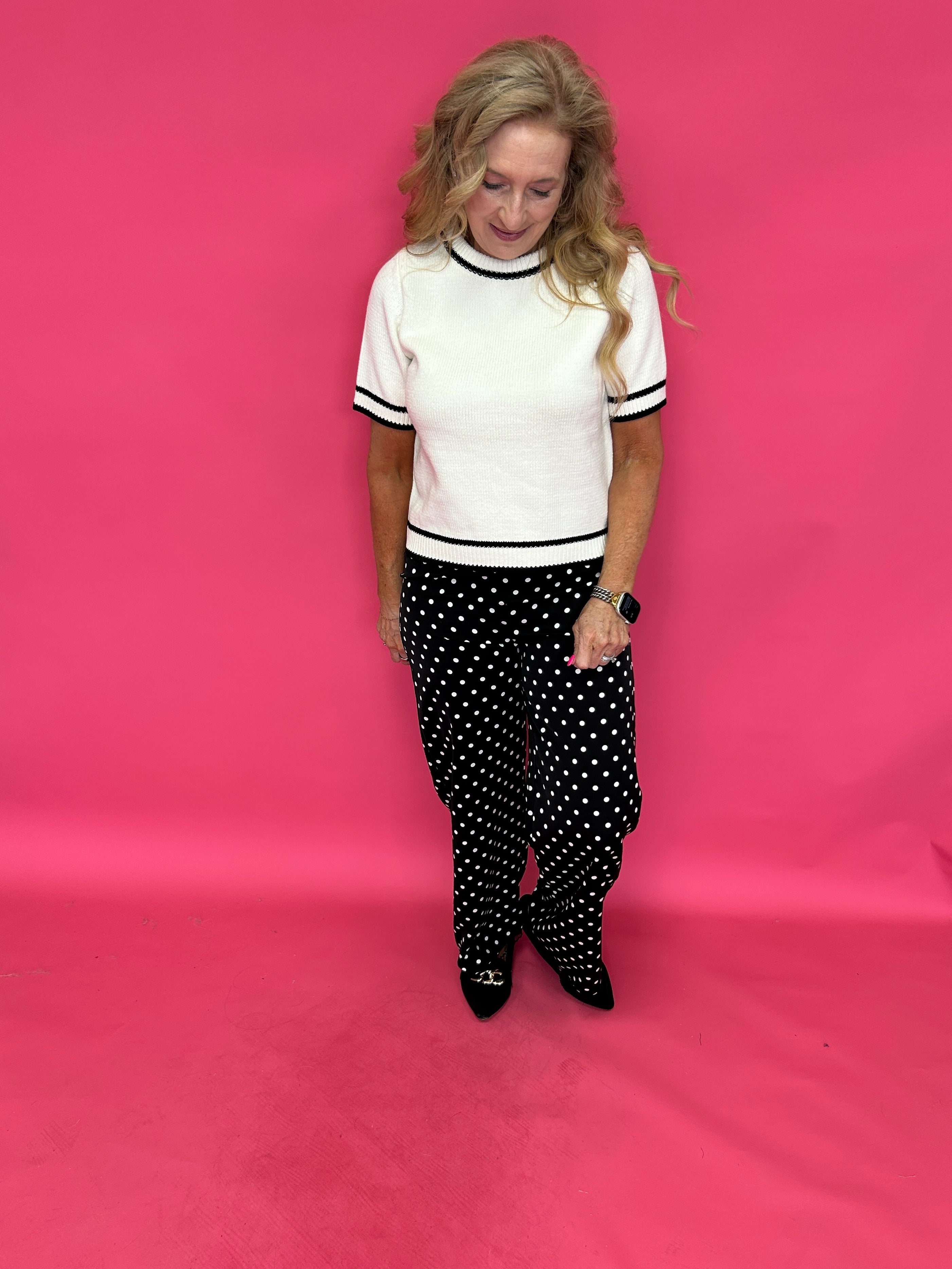 The silky satin fabric drapes beautifully with every step, while the classic black-and-white dot print keeps it timeless and versatile. They feel dressy… but they’re secretly as comfortable as your favorite lounge pants.