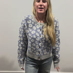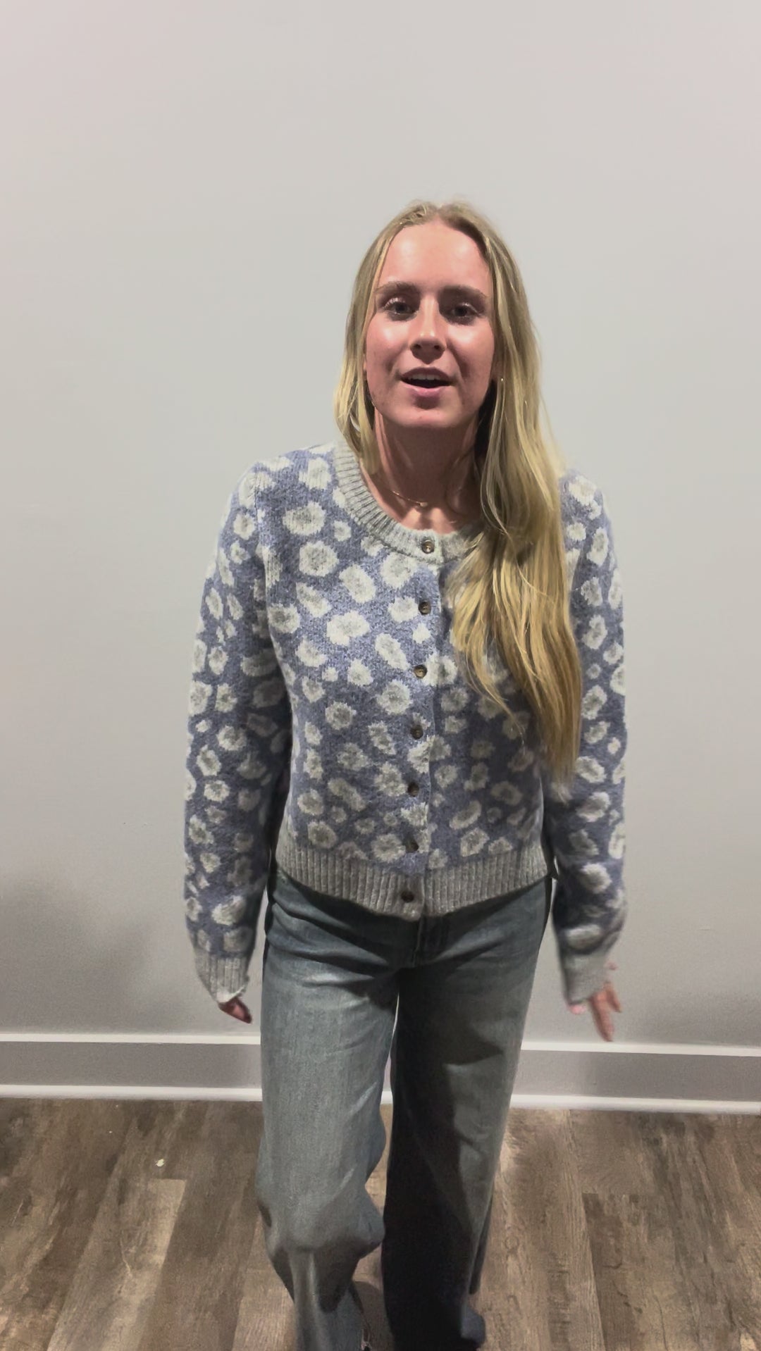 A leopard-pattern knit cardigan sweater with the following features: Round neckline. Button-front closure. Long sleeves. Contrasting ribbed knit collar, cuffs, and hem. Relaxed fit.