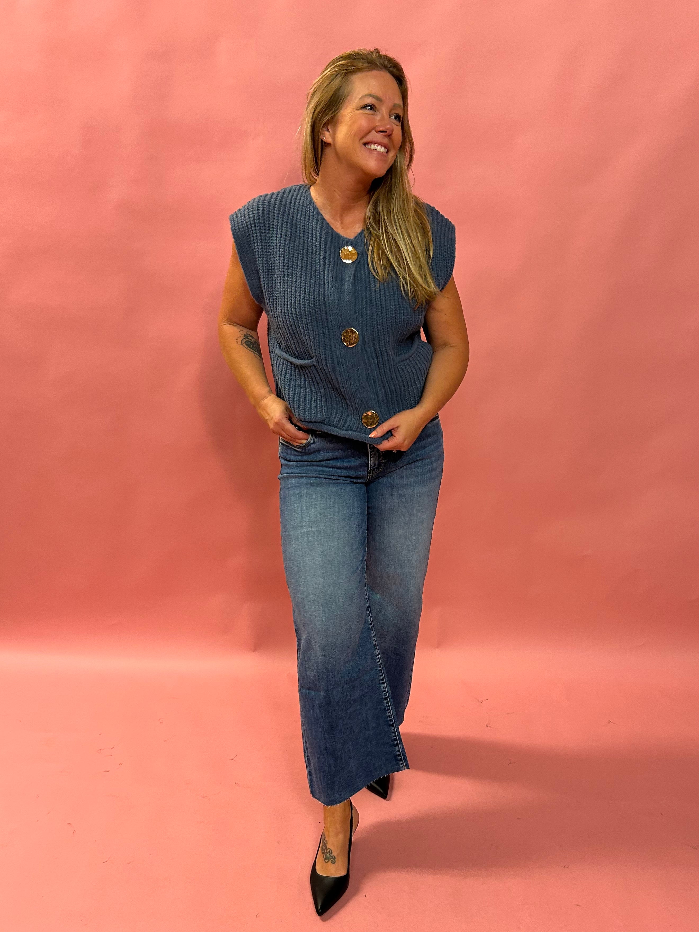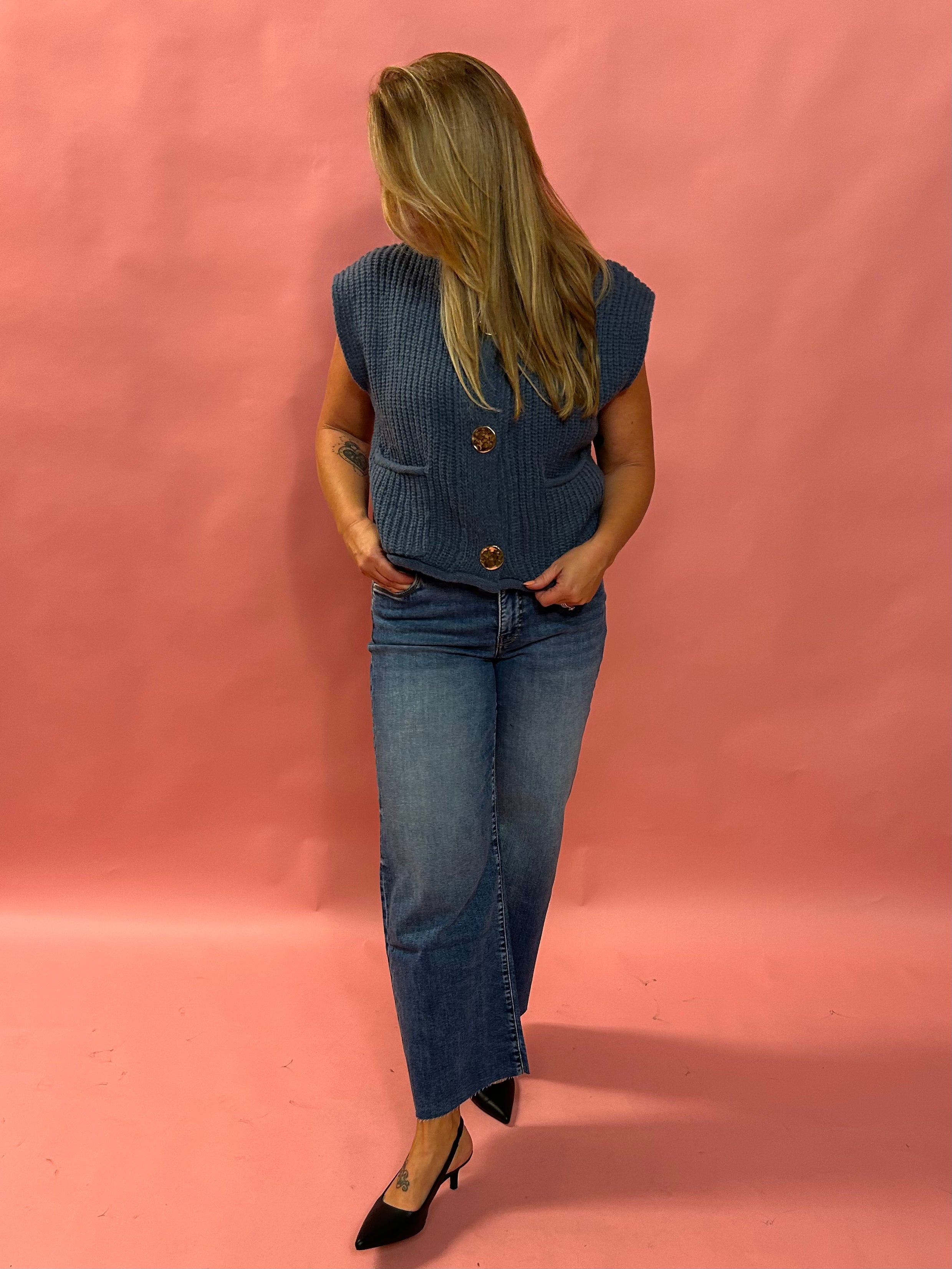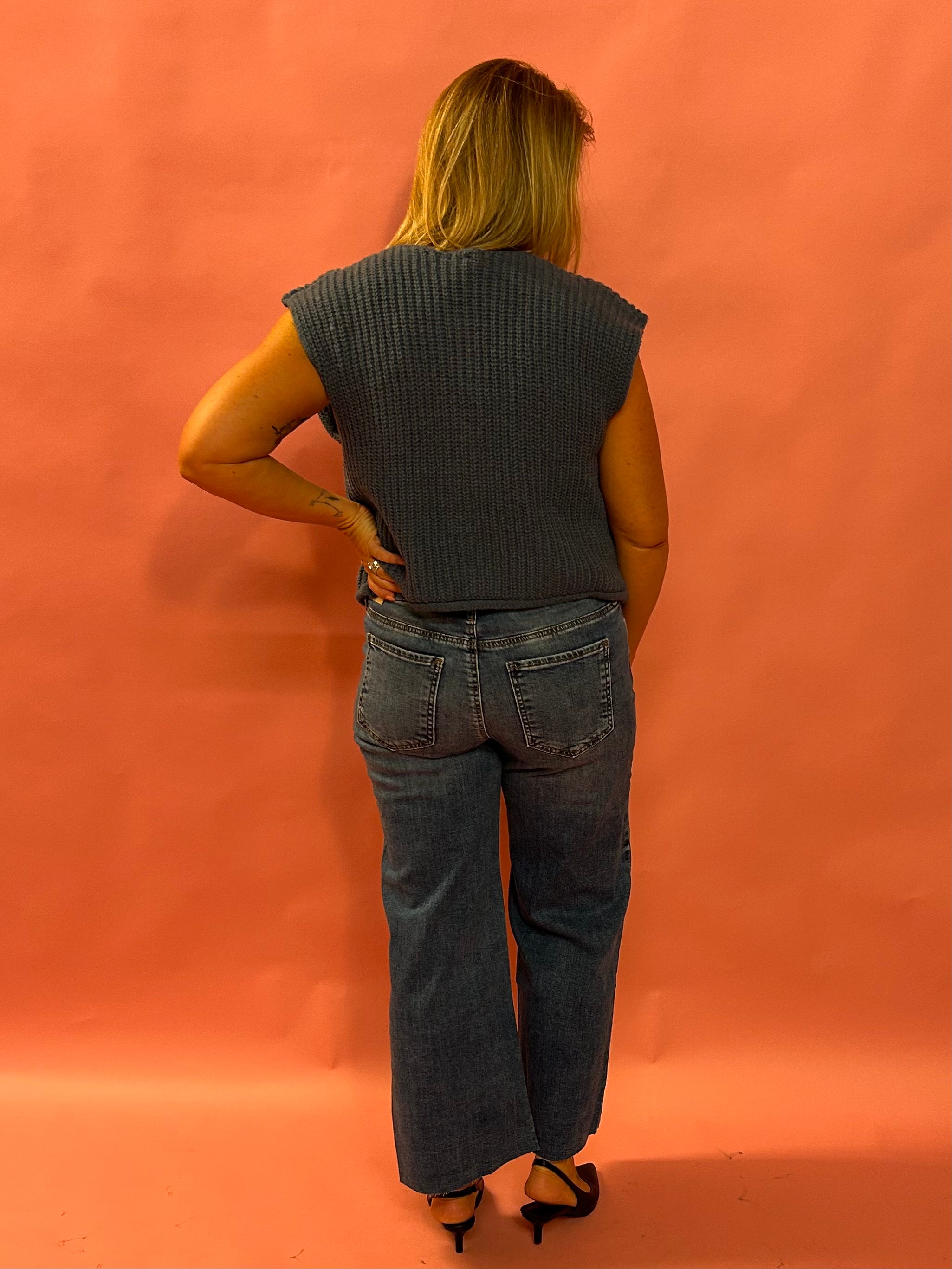 Bring the vibes with these high rise wide leg jeans, designed with our signature Fab Ab front pocket technology that smooths and supports in all the right places. The medium wash keeps things classic, while the raw hem adds an edgy finish that’s perfect for dressing up or down.