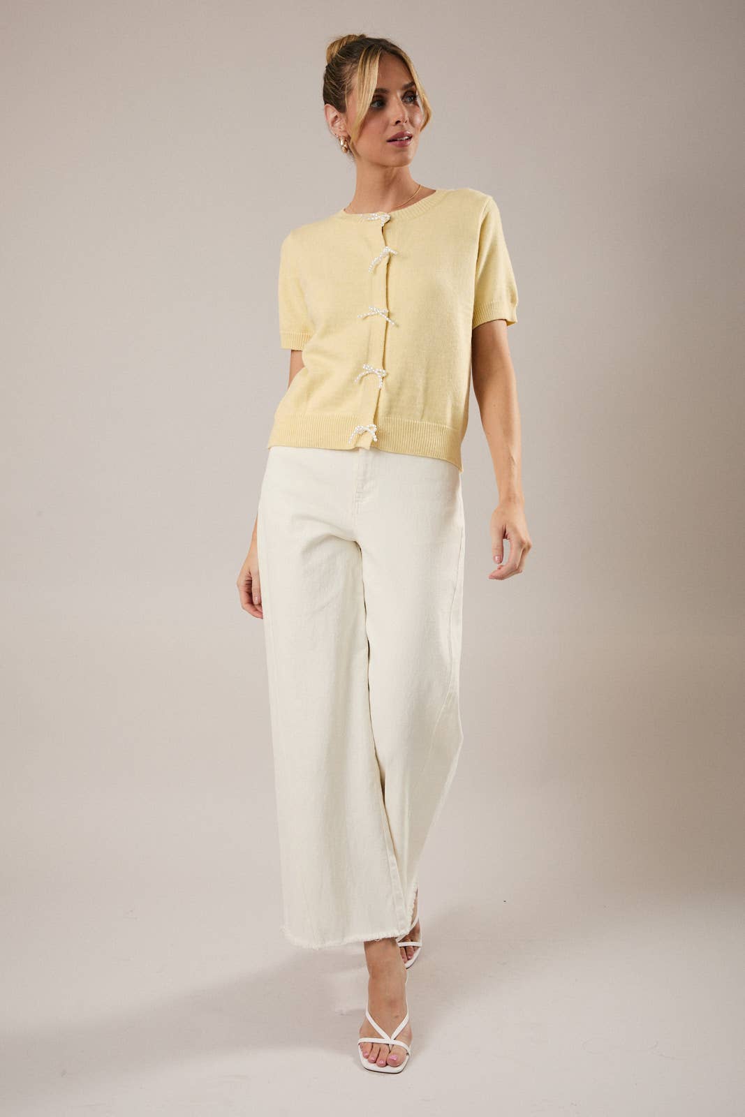 Oh, this one is such a charmer. Our Sweet Pearl Bow Cardigan is one of those pieces that feels ladylike the moment you slip it on. It’s a soft, cozy knit with the sweetest pearl‑trimmed bows that add just the right touch of elegance—pretty without trying too hard. The round neckline keeps it classic, and the fit is that easy, comfortable style you can wear all day.