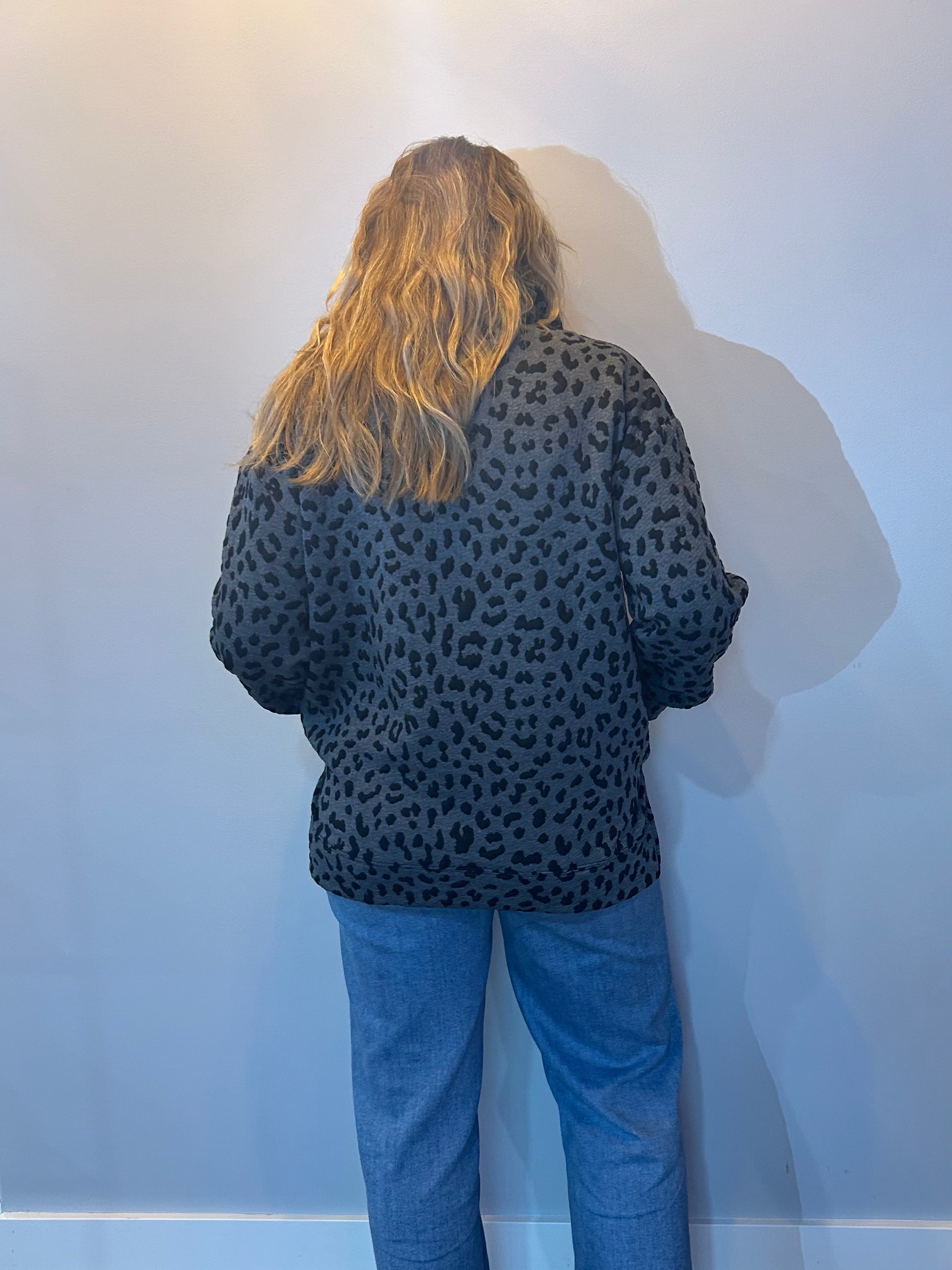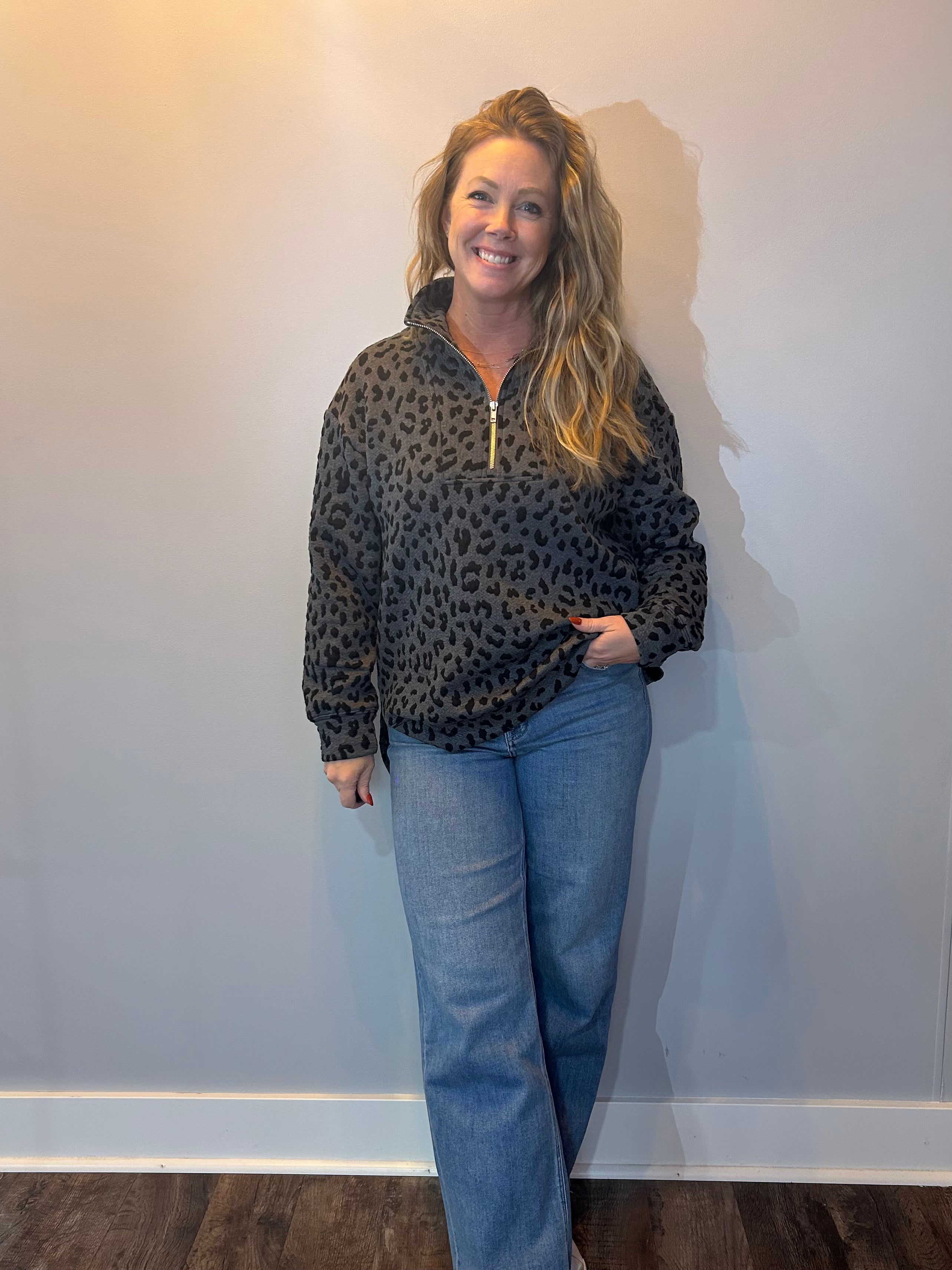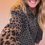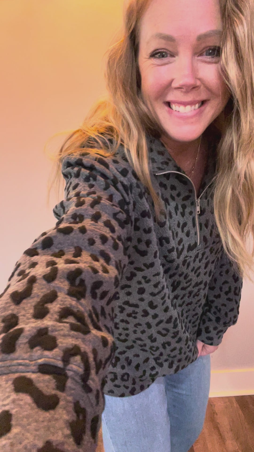 Meet your new “I look put together even when I’m running late” pullover. This grey quarter-zip features a subtle black cheetah print that adds the perfect pop of personality without going full-on wild. Soft, stretchy, and easy to throw on with anything, it’s the kind of everyday layer your closet will thank you for.