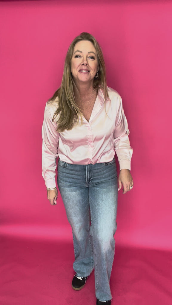 Sleek Satin Long Sleeve Button-Up Shirt in Pink