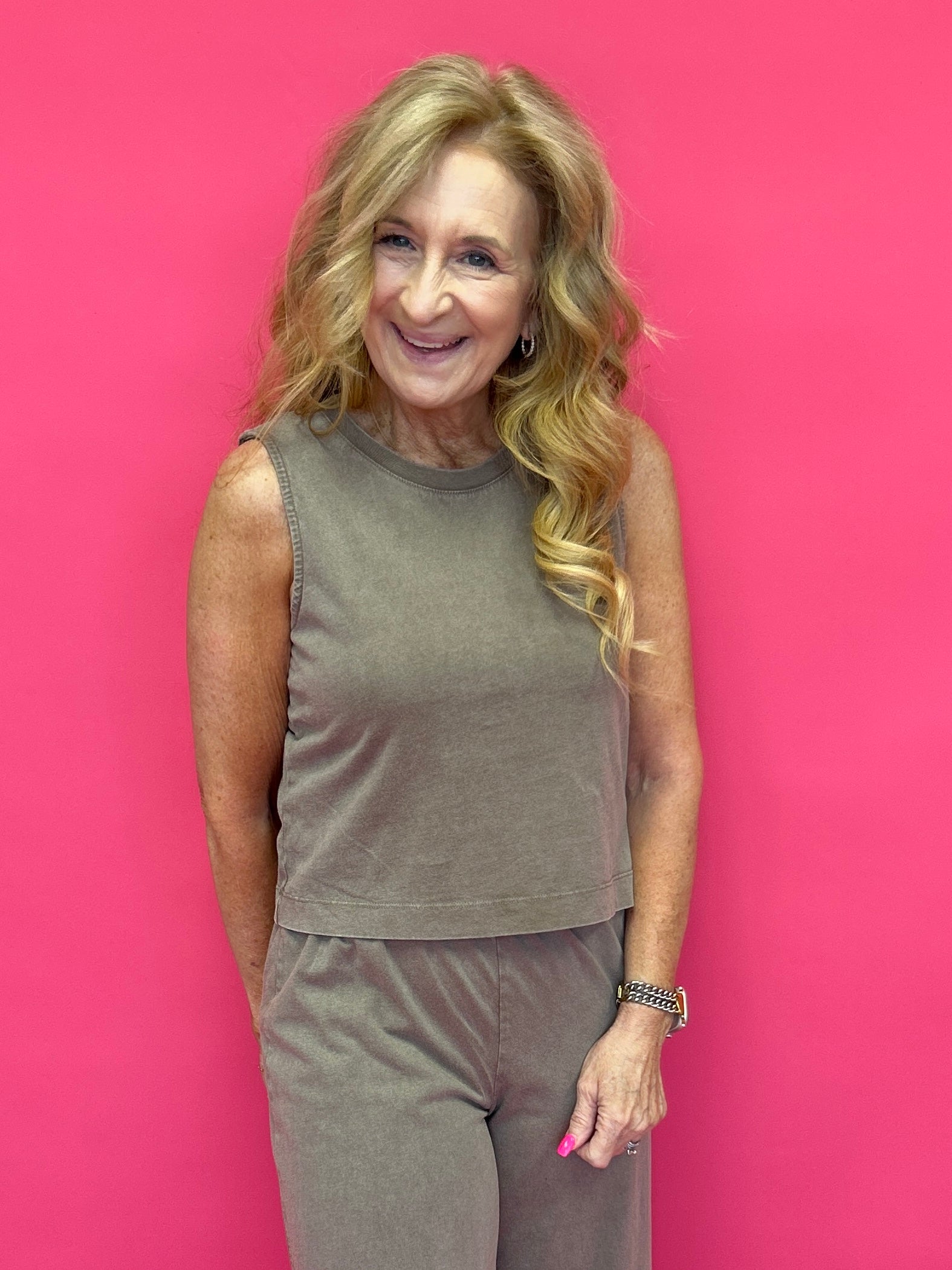 The sleeveless muscle shape with wide straps keeps it flattering and bra-friendly, while the mineral wash adds that subtle lived-in touch we love.