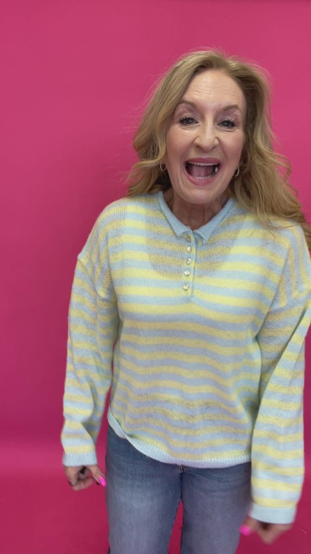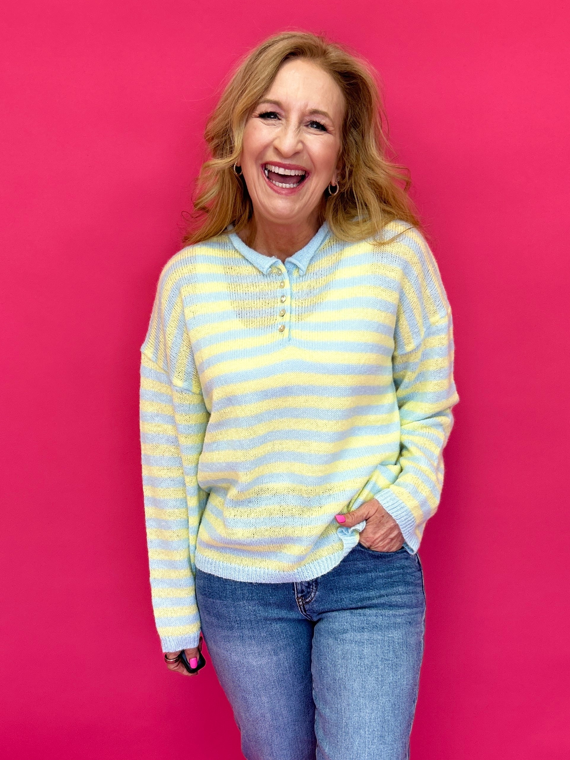 The Sunny Stripe Half-Button Knit Sweater is an easygoing long sleeve striped sweater that feels relaxed, fresh, and totally wearable. Designed with soft pastel stripes and a casual half-button neckline, this sweater features a subtle rolled hemline detail that adds to its laid-back charm. The relaxed fit makes it perfect for everyday wear while still feeling styled and intentional.