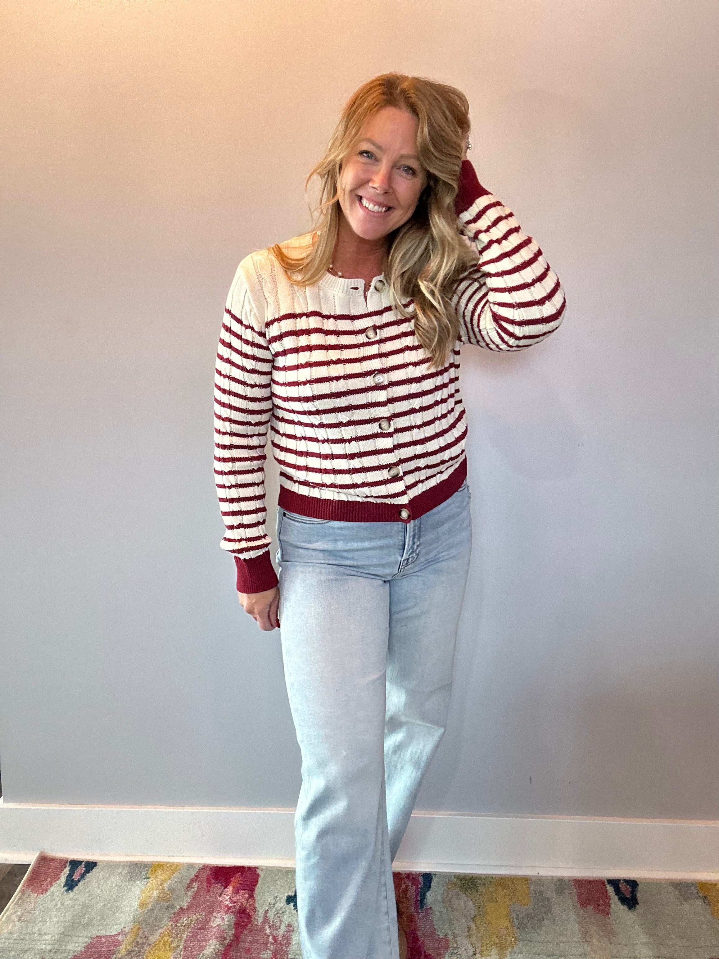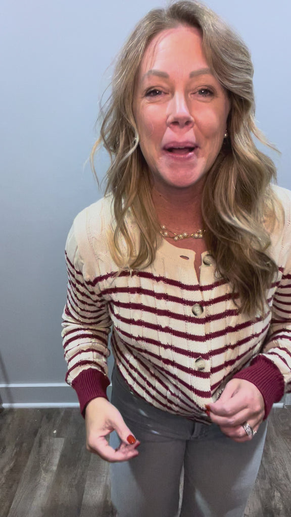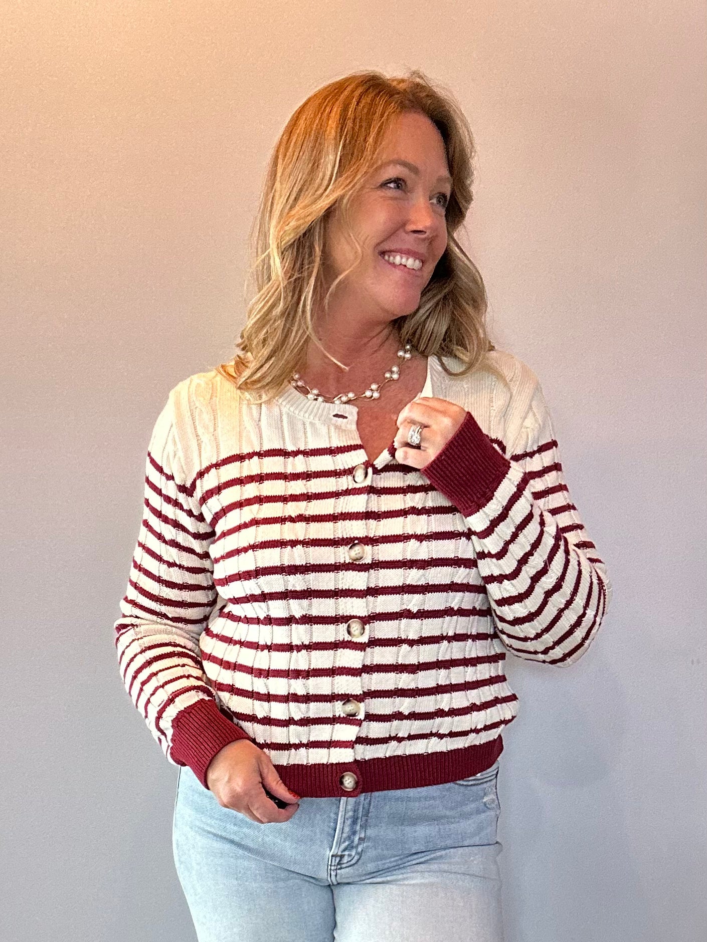 Classic with a twist, the Camden Cardi blends timeless cable knit texture with sporty-chic stripes for a look that’s effortlessly cool. Designed with a crew neckline and functional buttons, this lightweight sweater is perfect worn buttoned up as a top or open as a layering piece.