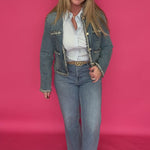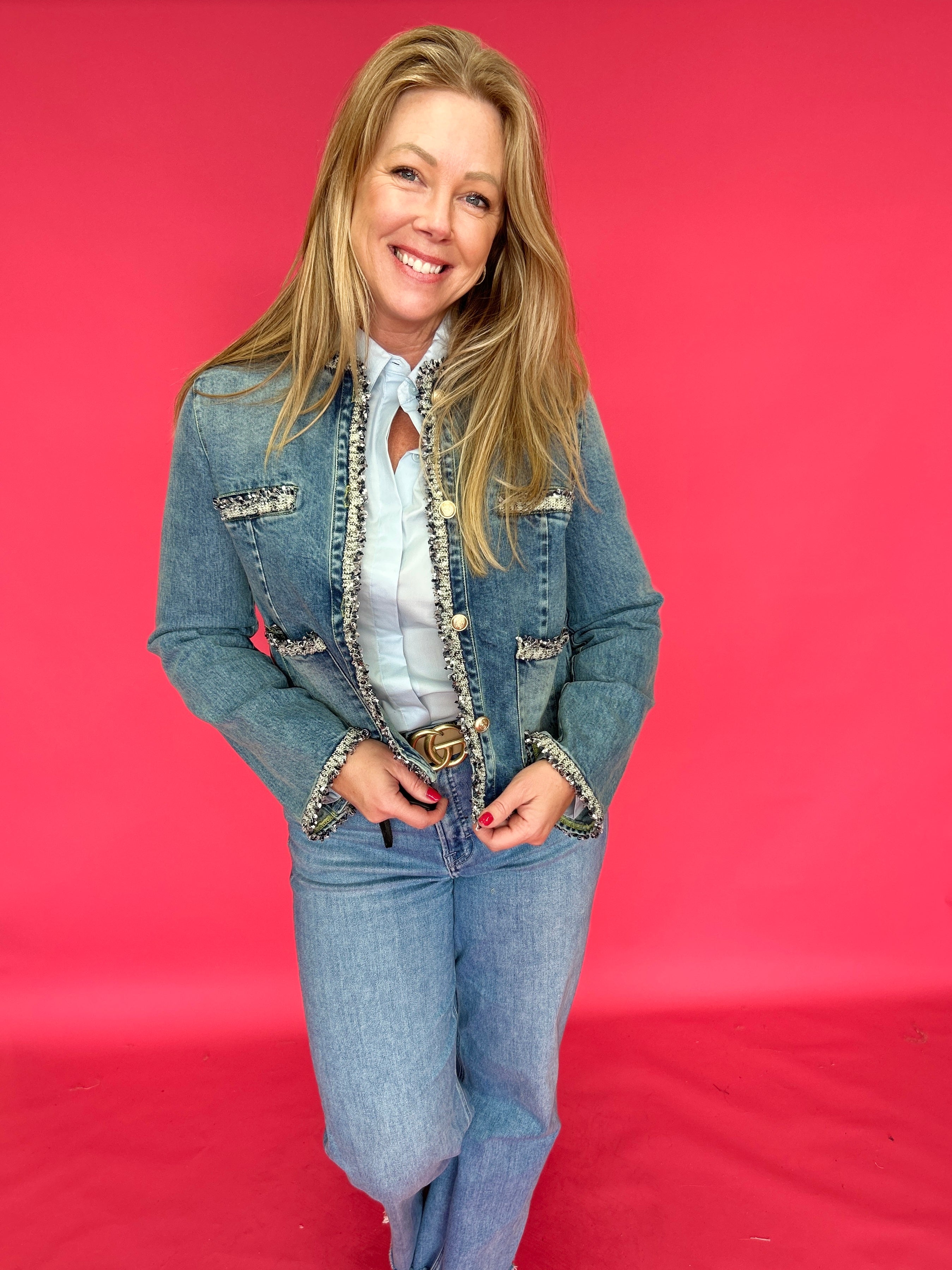 Classic denim gets a polished upgrade ✨ This tweed-trimmed denim jacket is giving effortless sophistication with a boutique twist. Designed with structured seams, functional front pockets, and contrast tweed detailing along the edges, it blends timeless denim with a refined, elevated finish. The gold-tone buttons add just the right amount of shine, making this jacket feel equally at home with casual denim or dressed-up looks.