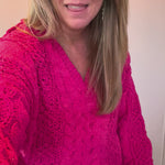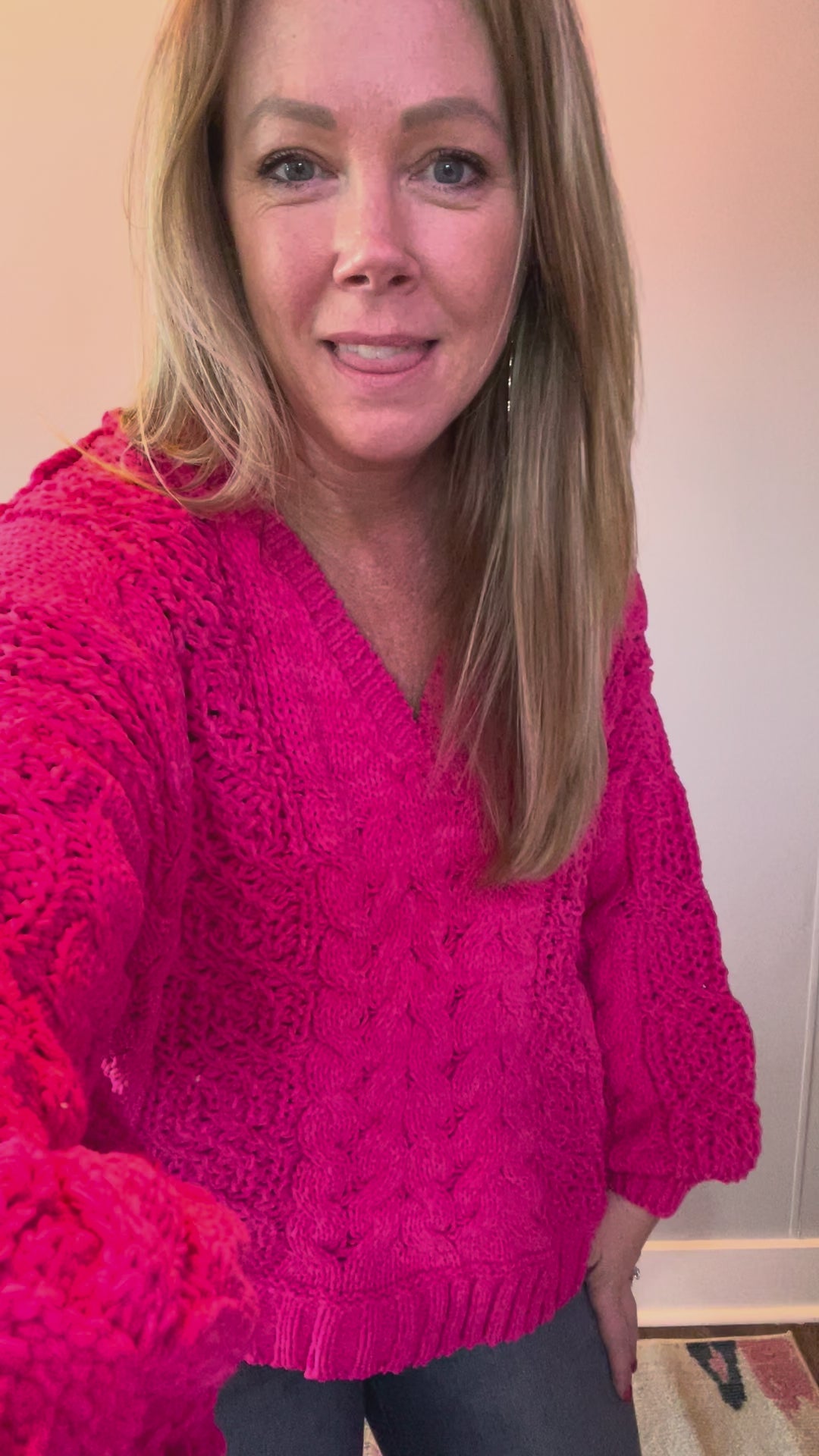 Elevated texture meets effortless style. This chenille sweater top features a flattering overlay V-neckline, balloon sleeves, and a semi-cropped fit that pairs perfectly with high-rise denim or skirts. The twisted knit detail adds subtle dimension, while the pointed solid pattern gives it a chic, modern edge. Made from plush chenille, it’s cozy yet sophisticated—the perfect go-to for cooler days.